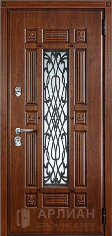 Фото «Входная коричневая дверь в частный дом со стеклопакетом и ковкой №11»